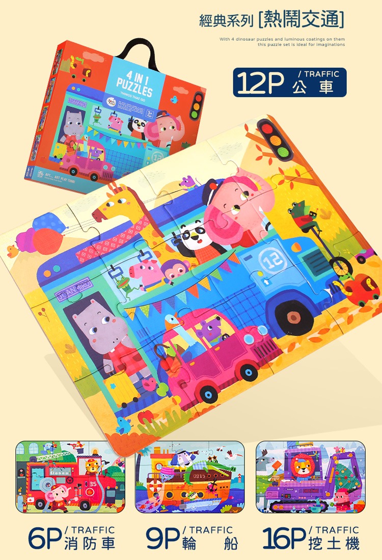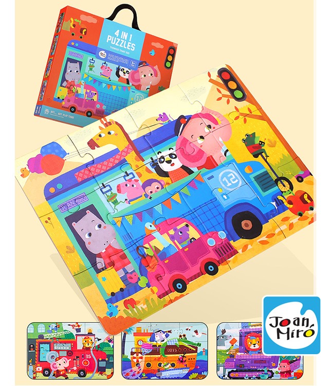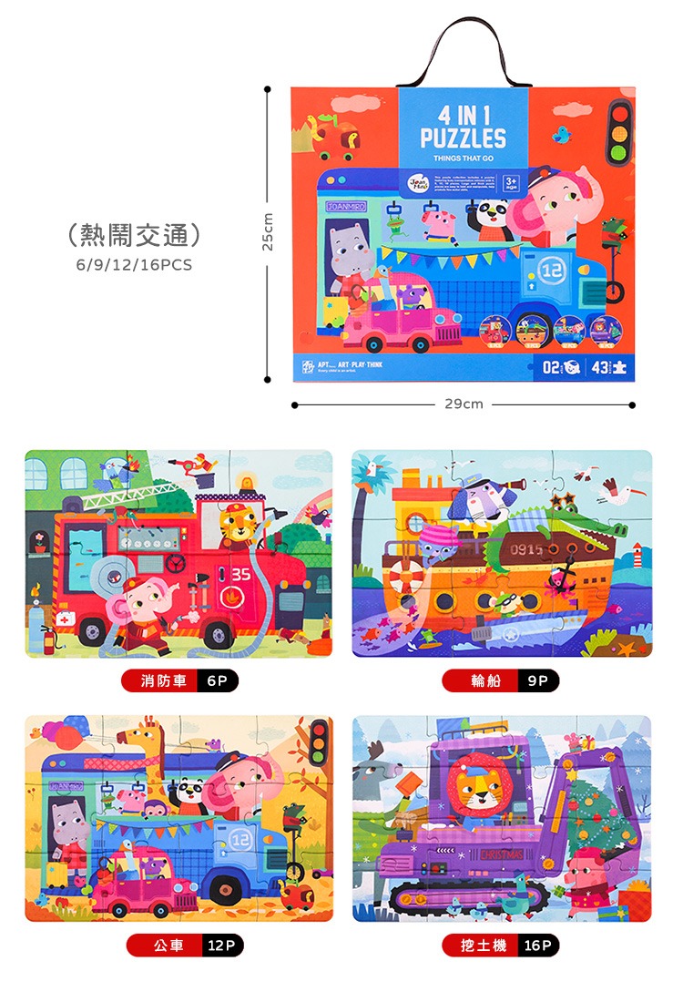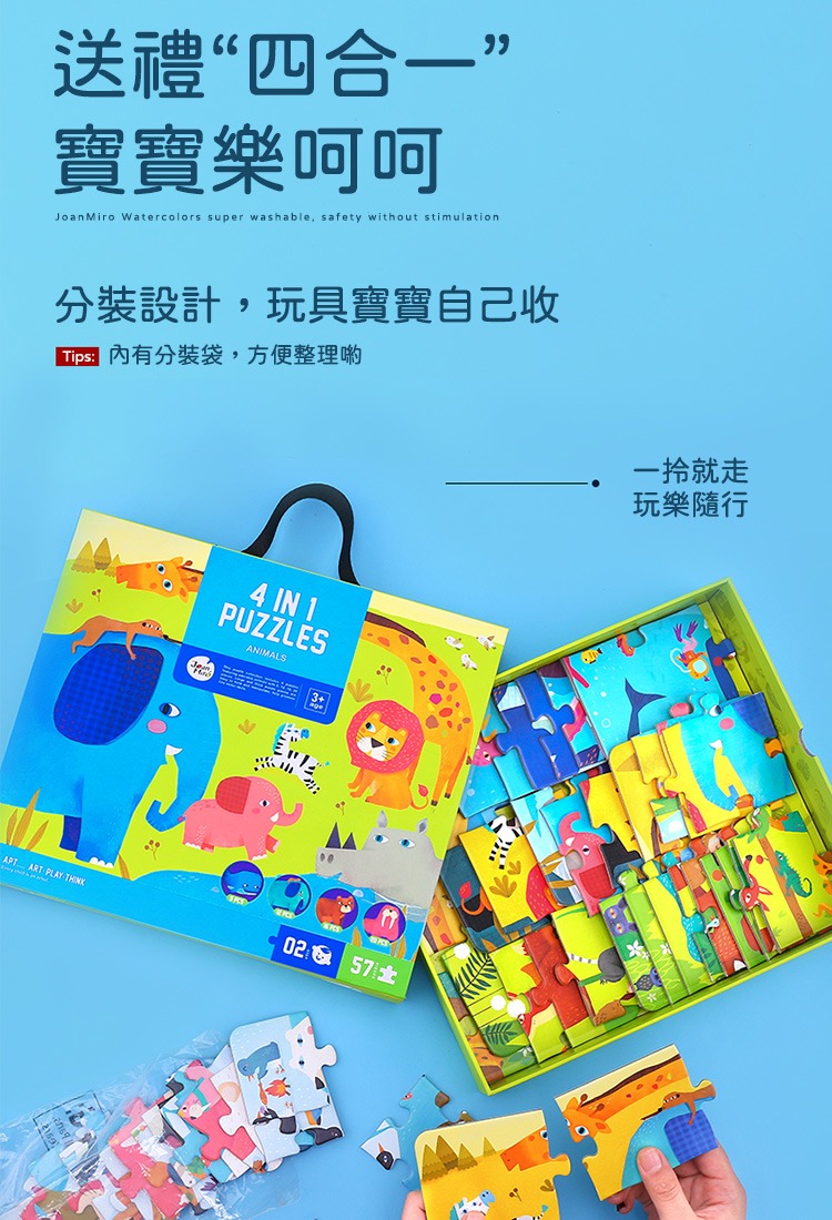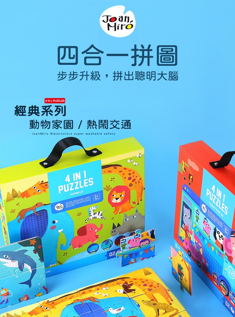 ➤2~4歲幼兒-啟蒙寶寶拼圖➤6P、9P、12P、16P;片數遞增➤動物搭配交通主題,精彩可愛➤提盒設計,一拎就走,玩樂隨行➤精美提盒裝,致贈親友好實玩~~~~~~~~~~~~~~~~~~~~【品牌】JoanMiro【品名】四合一拼圖【材質】紙【年齡】3歲以上【尺寸】29 x25 x5公分【重量】1kg