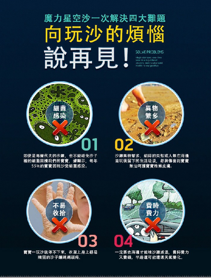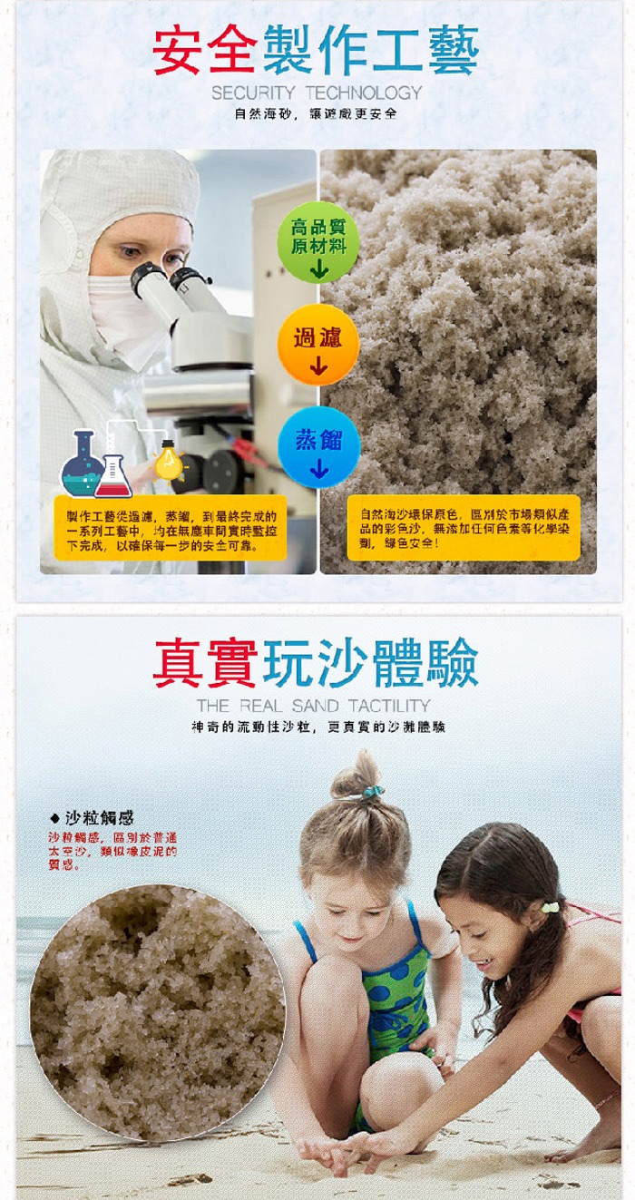 ◆寶寶的私人沙灘◆解決出外玩沙四大煩惱◆只選用無毒乳膠為結合劑◆給寶貝真實玩沙體驗