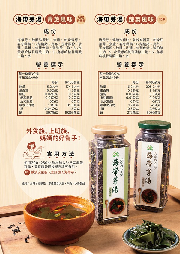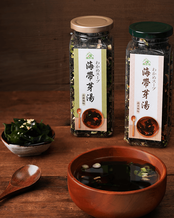 家庭主婦與外食族的好夥伴,將海帶芽放入碗中沖入熱水後等待2分鐘即有一碗熱呼呼的海帶芽湯。